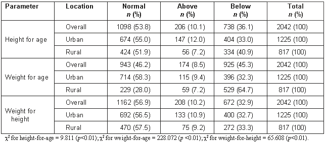 The overall nutritional status of the children studied is reflected in Table 2. The percentage of children whose characteristics fell within the prescribed norms varied between 46.2% and 58.3%, except for underweight among rural children (28%). Those above normal parameters varied from 7.2% (stunting and wasting) to 12% (height for age); however, the percentage of stunted children was high (36.1% overall, 33% urban, 40.9% rural). Wasting among children was high (32.9% overall, 32.7% urban, 33.3% rural); the percentage of underweight children was high (45.3% overall, 32.3% urban, 64.7% rural). The differences between categories were highly significant.