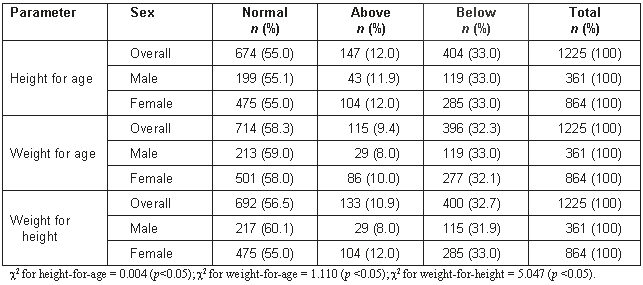 Regional (urban and rural) prevalence of each index was estimated. The number of underweight, stunted and wasted children were obtained by applying available standards7. The data were arranged according to Jelliffe's classification for determination of malnutrition. In this classification, the children whose weight was 90% of the standard weight for their age were considered normal. Those whose weight or height was greater than 10% were regarded as above standard and those below 10% were regarded as stunted, wasted and underweight, respectively. To test the significance of association between independent and dependent variables, Chi-squared (c2) test was used. The calculation was made using the formula: