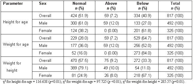 The physical growth of school children aged 6-9 years depends on environmental and genetic factors and their interaction. Among population groups who have experienced constraints on economic and social development, most of the factors that affect the physical growth of school children are related to the influence of environmental factors before puberty, including poor food consumption patterns, illness, lack of sanitation, poor health and poor hygiene practices10. In the present study, female children in rural areas were found to be grossly stunted (61.8%), wasted (84%) and underweight (67.1%). Differences in the treatment of boys and girls is often evident in healthcare and nutritional status. One in six female deaths is caused by gender discrimination and gross neglect. A strong preference for sons leads to the neglect of female children and their mothers. Female feticide is a growing practice on the Indo-Pakistani subcontinent. If the present trend continues, a significant demographic imbalance could result. At the time of the study, the male : female ratio in Pakistan was 10 : 6, and higher in urban areas, due to male-dominated migration from rural areas as men seek employment 6.