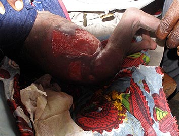 The combination rifampicin-streptomycin recommended by WHO for BU treatment4 was not prescribed because streptomycin was contraindicated in this 24 day-old newborn. Surgery (large excision) under general anesthesia and medical transfer to the nearest provincial hospital were not possible due to logistical constraints. Consequently, the patient was treated with oral ampicillin. The dressings were changed daily with an aqueous solution of chloramines-metronidazole-nitrofurandoïne5. Unfortunately, the patient died 2 weeks later.