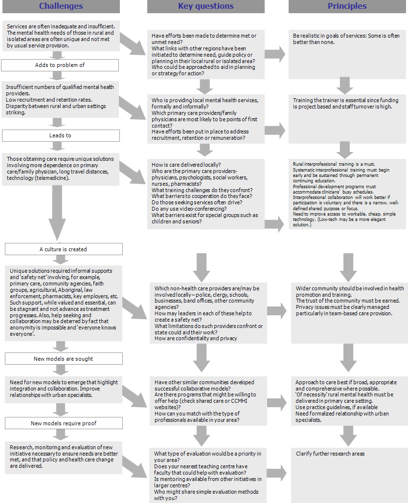 As a visual guide and overview, a flow diagram is offered (Fig2) detailing the challenges associated with rural and isolated mental healthcare service delivery; specifying key questions to be asked; and offering principles to follow when contemplating the implementation of collaborative care initiatives in rural and isolated regions. Figure 2 attempts to provide a synthesis and practical application of the toolkit by describing major obstacles or barriers to collaboration in rural and remote areas, questions to assist in addressing related issues and listing principles appropriate to consider.
