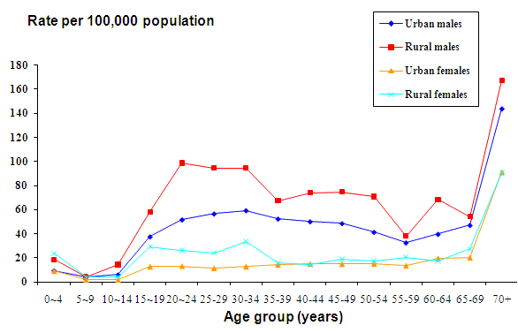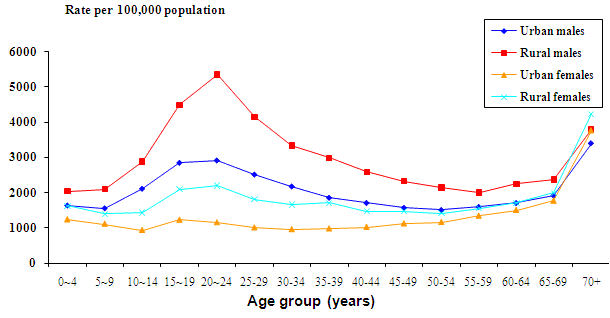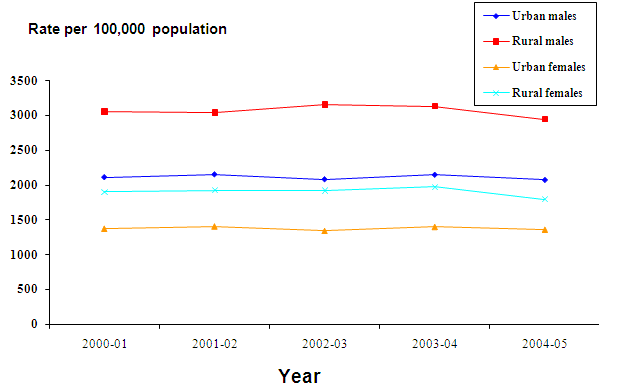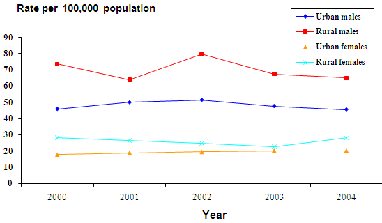 There were 11 577 injury-related deaths during the period 2000 to 2004, giving an overall rate of 34.2 per 100 000 population. Of these, 10 421 (90.0%) were of urban (33.2 per 100 000 population) and 1156 (10.0%) were of rural (48.1 per 100 000 population) residents. Rural males had the highest injury mortality rate (69.9 per 100 000 population) and this was 1.5 times higher than the rate of urban males (48.1 per 100 000). Rural females had an injury mortality rate approximately 1.3 times higher than their urban counterparts (26.0 per 100 000 and 19.3 per 100 000, respectively). Injury mortality rates were higher in rural compared with urban residents over time (Fig3). Males aged 70 years and over and 20-34 years had the highest rates of injury mortality. Rural females aged 15-34 and rural and urban females aged 70 years and over had the highest injury mortality rates for females. Rural children aged less than 5 years had injury mortality rates twice as high as urban children (Fig4).