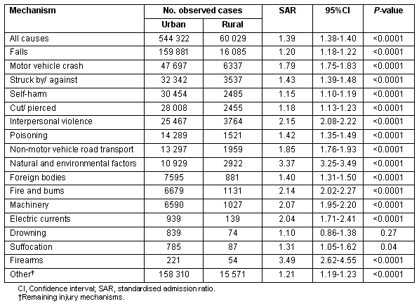 Analysis was performed using SAS v9.1 (SAS Institute. Cary, North Carolina, USA). For hospitalisation and mortality data, age- and sex-specific population estimates as at 31 December and 30 June 2001 were used as the standard population, respectively, obtained from the NSW Health Department. These estimates are based on the ABS population estimates14. Direct age standardised rates were calculated using the estimated Australian residential population at 30 June 2001 as the standard population. Standardised mortality ratios (SMR) and standardised admission ratios (SAR) were calculated for specific injury mechanisms. Indirect age standardised rates were used to calculate the SMR and SARs using the age-specific rate for urban residents as the standard rate. Ninety-five percent confidence intervals (95% CI) were calculated assuming a Poisson distribution15,16. P-values were generated using the method of exact confidence intervals of the SMRs17. For the analysis, the statistical local area (SLA) of residence of the injured person was used to identify the geographic location, the ARIA+ classification groups of 'major cities' and 'inner regional' were defined as 'urban', while the classification groups of 'outer regional', 'remote' and 'very remote' were defined as 'rural'.