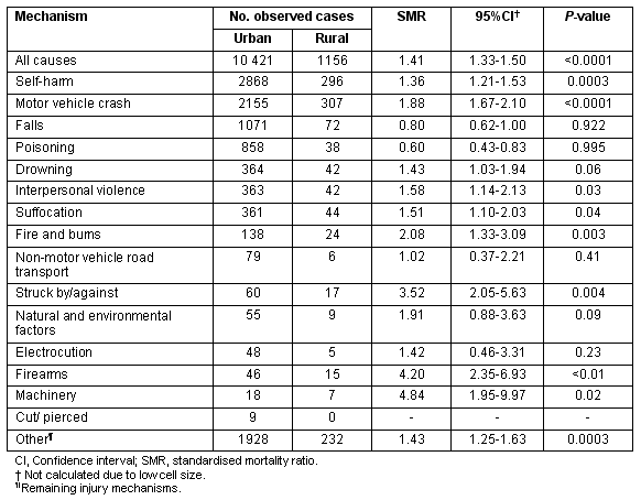 Table 2: Urban and rural indirect standardised mortality ratios for injury-related deaths in New South Wales by injury mechanism, 2000-2004