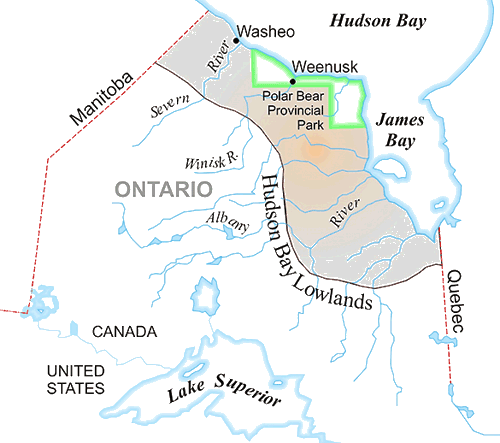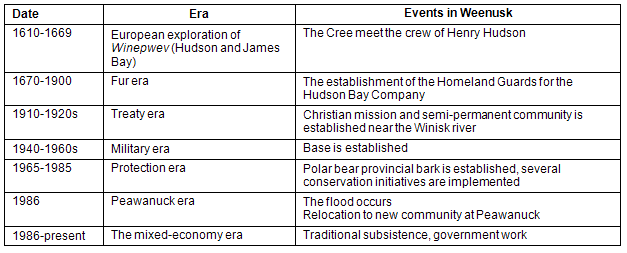 The Weenusk (ground hog in Cree) Cree First Nation once traded with the Hudson's Bay Company along the length of the Hudson Bay and James Bay coastlines from York Factory in the west, to Fort George in the east24. The establishment of the trading post on the Winisk River in the late 19th century, and a permanent Roman Catholic Mission in the early 20th century encouraged some of the Cree families to become more sedentary and increasingly dependent on manufactured goods24. Dealings with federal officials began after the ratification of Treaty 9 in the 1930s, while interactions with provincial officials began to occur after World War II25. The military era (1950-1965) was a time when infrastructures, the wage economy and mechanization (eg outboard motors, snowmobiles) appeared and more localized lifestyles through permanent dwellings were encouraged; this era was followed by the conservation and protection era in the 1970s and early 1980s (highlighted by the establishment of Polar Bear Provincial Park in 1970).