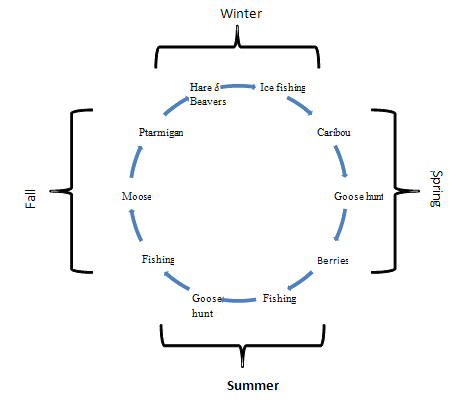 The importance of hunting and fishing and sharing of wild foods in Weenusk should come as no surprise, for the Cree cycle of harvest is based on the seasonal harvest of wildlife similar to the Dene seasonal harvest cycle (Fig 3)44.