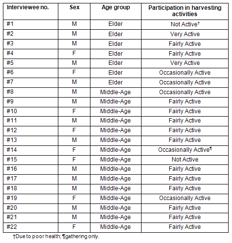 The 22 participants listed in Table 2 were segregated along three categories. They were divided by sex and age-status. While participants were not asked their age, the category of 'middle-age' here is defined here as 30-55 years, while Elders are defined as 55 years and older. Participants were also segregated based upon their involvement in harvesting activities. These include hunting, fishing and gathering as well as the preparation (ie skinning and butchering) of the harvested resources. Those who were considered to be 'very' active participated in harvesting activities at least four times a week. 'Fairly active' accounted for individuals who participated in harvesting activities three times a week on average. 'Occasionally active' refers to those individuals who participate in harvesting activities twice a week or only on special occasions (eg Spring Goose Hunt). 'Not active' refers to those who do not participate in traditional harvesting activities, but may still consume traditional foods.