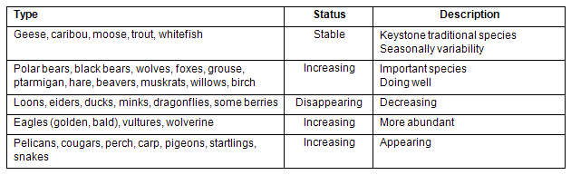 Whether it is the ice from the Hudson Bay and/or the Winisk River constantly eroding the river banks and creating new islands in the river estuary, or the changing landscapes of Hudson Bay shorelines through isostatic rebound, and the melting permafrost of the tundra, the land is always changing. These changes have had both positive and negative outcomes: some wildlife species such as, loons, eiders, and some types of berries are declining and even disappearing, while others like eagles and vultures are prospering and snakes, cowbirds, pelicans, pigeons, and starlings are being seen for the first time (Table 3).