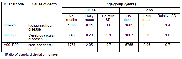 Table 1: Overview of mortality database in Yakutsk: total number of deaths in 1999-2007, mean daily rates and relative standard deviations of daily deaths