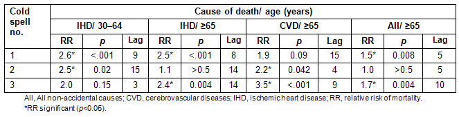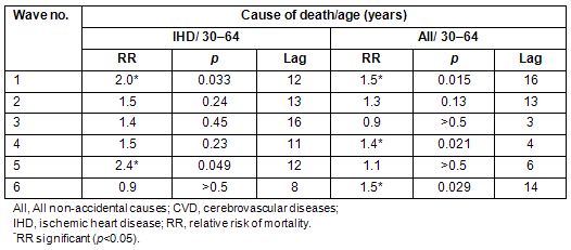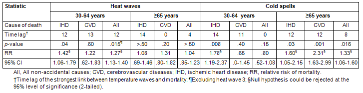 As Table 5 shows, only two of the six heat waves significantly affected mortality from IHD (waves 1 & 5, with corresponding RR 2.0 & 2.4), and three waves significantly affected mortality from all non-accidental causes (waves 1, 4 & 6, with corresponding RR 1.5, 1.4 & 1.5).