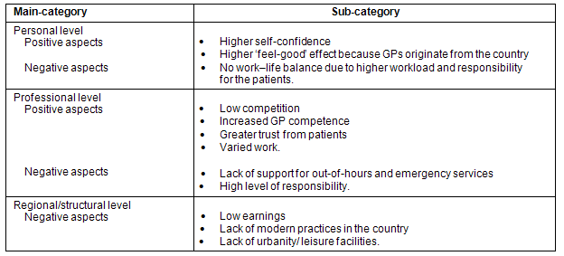 Negative aspects: The workload of practising as a GP in a rural area is considered higher than that of a GP in an urban area. The responsibility of being available for patients around the clock constitutes a large burden for country doctors, which influences their work-life balance in a negative way: