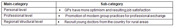 Measures suggested by the GPs to increase the attractiveness of practising as GP in a rural area are reported (Table 3).