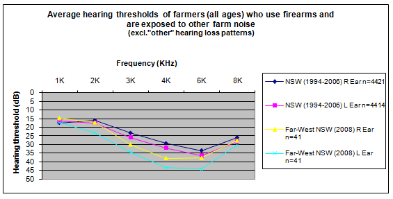 Figure 1: Comparison of audiometric results for farmers who reported using firearms in the Far West (2008) and New South Wales (1994-2006).
