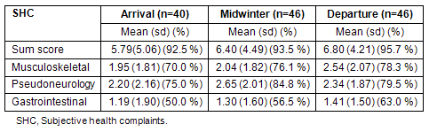 There were no significant changes in SHC (sum score, musculoskeletal complaints, gastrointestinal complaints, or pseudoneurology) during their stay in Antarctica (Table 1).