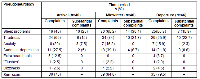 Table 2: Participants reporting pseudoneurological complaints at arrival, midwinter and departure