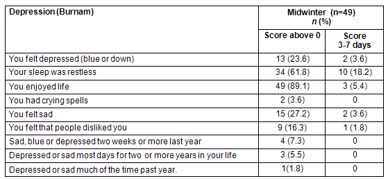 There were no corresponding high scores for depressive symptoms during midwinter on the SHC. There was no significant increase in pseudoneurology, which includes questions on mood. Therefore the scores on single items from both the Burnam screen for depression and the pseudoneurology scale from SHC were examined (Tables 2,3). According to Burnam screen for depression, 13 (23.6%) of the participants reported that they had felt depressed some or a little of the time, while 2 (3.6%) reported they had felt depressed occasionally or a moderate amount of days. In all, 18 (39.1%) scored above 0 using the SHC score on depression, and 4 (8.7%) reported that they had some (score 2) or serious (score 3) depression during the last 30 days.