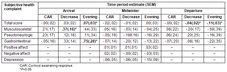At arrival, a high score on SHC sum score and gastrointestinal complaints where associated to high cortisol levels in the evening (22.00 h) (Table 4). At arrival, a high score on musculoskeletal complaints was associated with a higher mean level for cortisol decrease during the day (Table 2). There were no significant associations between SHC and CAR at arrival.
