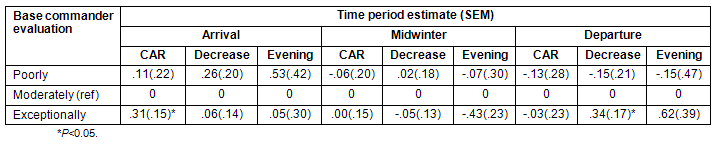 Period differences in diurnal rhythm of cortisol were tested by contrasting cortisol levels from the first week after arrival at the station with those during midwinter and the week before departure. In order to see the effect of base commander's evaluation, subjective health complaints, depression, positive and negative affect on the cortisol rhythm in the different periods, the specific variables were added to stratified models (stratified by period), one at the time. Furthermore, the base commander's evaluation was included as a categorical variable in the stratified models, where the category 'moderately well adapted' was used as the reference value.