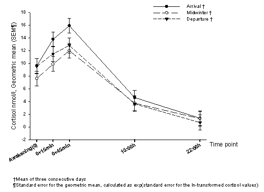 The participants had a normal diurnal rhythm of cortisol, with the characteristic peak level in the morning and a normal and gradual decrease towards the evening, at arrival, during midwinter, and before departure from the base. The awakening time was 08.00 h, local time, on an average. Local time at Halley was GMT -3 hours, at Rothera GMT -4 hours.