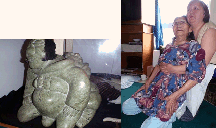 Figure 1: (Left) Nunavut sculpture 'Woman Giving Birth', 1968, by Elijah Michael (b. 1929, d. 2008) of Kimmirut, collection of the Nunatta Sunakkutaangit Museum, Iqaluit. Permission to reproduce the photograph of sculpture was granted by Brian Lunger Manager/Curator, Nunatta Sunakkutaangit Museum. (Right) Traditional midwife Orsoralik Ottokie, Elder of Dorset Bay, performing a traditional demonstration of fundal pressure on Natsiq Kango. Orsoralik Ottokie passed away at the end of March 2010 and this image is a tribute to her. Permission to reproduce the photograph was granted by Natsiq Kango, Qapik and Orsoralik Ottokie.