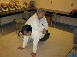 Figure 2: Traditional midwife Qapik Attaqutsiak demonstrates the traditional practice for birthing the placenta on her daughter-in-law, Natsiq Kango. Permission granted to reproduce the photograph was granted by Natsiq Kango and Qapik Attaqutsiak.
