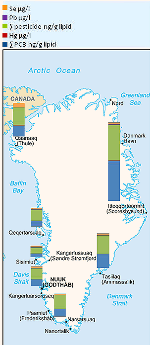 Figure 3 shows Greenland with geographical located columns showing the relative total sum of POPs exposure biomarkers, and within the column the relative profile of each POP group determined in human serum typically including the 50 men and 50 women from each district14. It is evident that both the sum of PCBs and the sum of organochlorine pesticides are highest in the East Greenlandic district (EG) (Scoresbysund) followed by Tasiilaq (EG) and the Thule district in Northern Greenland (NG) and Narssaq in South Greenland (SG). For Qeqertarsuaq (Godhavn, Disco Bay) and Nuuk (West Greenland, WG) the sum of PCBs and organochlorine pesticides are very similar. However, it should be noted that the data for Nuuk men are atypical as they were older and had a higher dietary intake of seabirds and, therefore, a higher level of serum POP concentration. In general the POP levels in Nuuk and Sisimiut, the two most Westernized cities in terms of diet, are at the same level and lower than for POP measurements in the other Greenlandic districts. What also should be noted is that selenium and mercury serum concentrations were found at the highest level in the Thule area. With respect to serum lead, the highest levels were found in Scoresbysund.