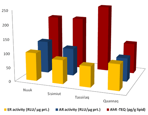 Preliminary data for serum POP related ER activity for Scoresbysund, Godhavn and Narssaq shows a trend of higher frequency of serum samples from East Greenland (Scorebysund) eliciting antiestrogen activity compared with West Greenland (Godhavn and Narssaq) (EC Bonefeld-Jørgensen; unpubl.data, 2010). The trend was similar for men and women. These data supports observations on the antiestrogene potentials of POPs as the highest ∑ POP concentrations were found in Scorebysund and Tasiilaq (Fig3).