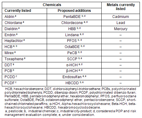 Table 1: Chemicals currently listed under the Annexes to the Stockholm Convention and chemicals proposed to be added to the convention annexes8