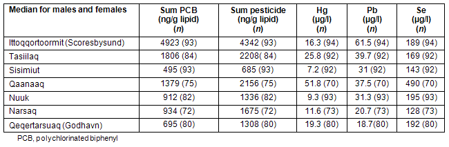 During recent years there has been a shift away from the intake of traditional Greenlandic diet to imported food from supermarkets. This is particularly pronounced in major towns such as Nuuk and Sisimiut on the west coast and women seem to have a higher intake of imported food. However, the traditional diet still plays a major social, cultural, economic and dietary role of the Indigenous population7,8. The observed shift from traditional to imported diet is reflected in findings that fewer women of childbearing age are exceeding international recommendations for blood level of PCBs, mercury and lead8.