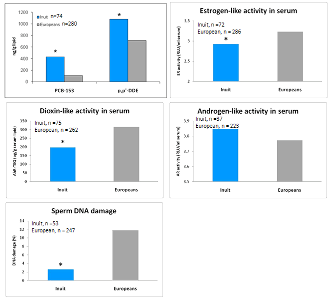 Figure 5: Biomarkers for exposure and biomarkers for effects in Inuit and European males. The POP proxy markers (PCB-153 and p, p'-DDE) are given as nanogram per gram lipid. Dioxin-like activity is given as aryl hydrocarbon receptor - TCDD toxicological equivalents (AhR-TEQ). ER, AR activities are given as relative light unit per milliliter serum. P <0.05, Inuit vs Europeans.