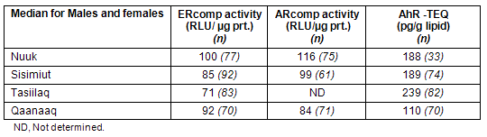 The POP related dioxin-like serum activities is given by TCDD toxicological equivalence (AhR-TEQ). The following order of AhR-TEQ medians was observed: Tasiilaq ≥ Sisimiut ≥ Nuuk > Qaanaaq (Fig4). The frequency of serum extracts representing agonistics AhR activity was 71-100% and similar levels were found in women and men25.