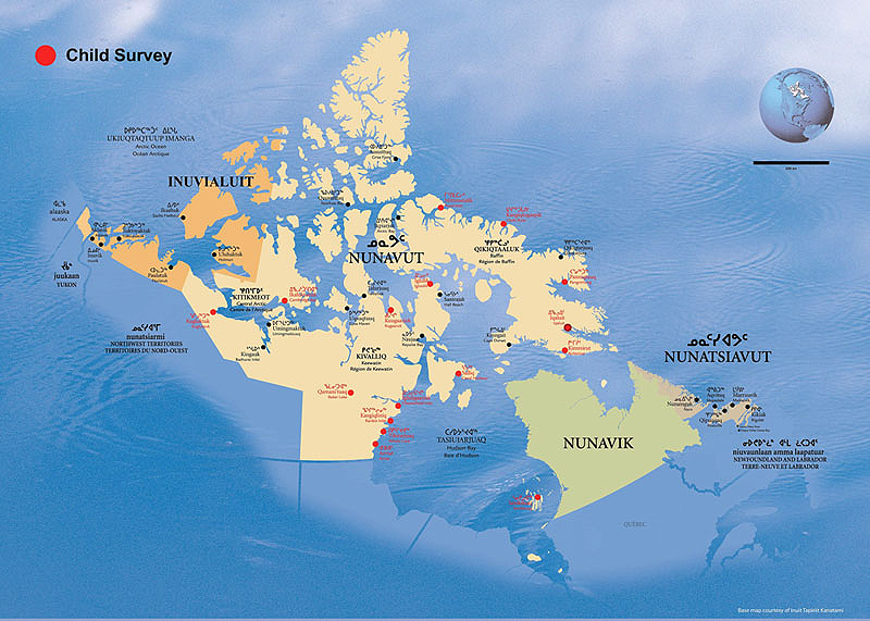 The study was developed in a participatory process17 with the Nunavut Inuit Health Survey Steering Committee Qanuippitali? What about us, how are we?. The committee includes representation from the Nunavut Association of Municipalities, the Nunavut Tunngavik Incorporated, the Government of Nunavut Department of Health and Social Services, University of Toronto, and the Centre for Indigenous Peoples' Nutrition and Environment (CINE), McGill University. The steering committee was active in determining the content of the child health survey. A Scientific Research License was obtained from the Nunavummi Qaujisaqtulirijikkut (the Nunavut Research Institute). The McGill Faculty of Medicine Institutional Review Board issued a certificate of ethical acceptability. Written and signed informed consent forms were administered following viewing of an informational DVD available in Inuktitut, Inuinnaqtun and English.