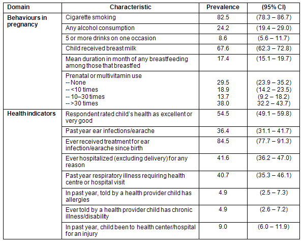 The weighted prevalence of caregivers' assessment of child health was excellent, very good, good, fair, and poor for 22.8%, 31.6%, 37.3%, 7.7%, and 0.5%, respectively. Respondents reported past-year ear infections or earache for 36.4% of children with 12.3% suffering from 6 or more episodes in the past year. A high prevalence (41.6%) of children were reported to ever have been hospitalized (excluding deliveries) and, within the past year, 40.7% of the children had had to be taken to the health centre or hospital for a respiratory problem. In contrast, allergies, asthma, a chronic disability or illness, and past-year injury were not as commonly reported (4.9%, 4.0%, 4.9%, and 9.0%, respectively). The majority of injuries reported were minor scratches and bruises. Almost 23% of children currently took a vitamin or supplement, with vitamin C and multivitamins being the most frequently taken.