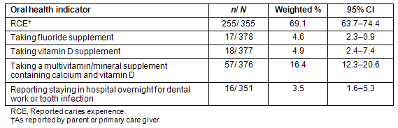 Table 1: Weighted prevalence of reported caries experience and other related oral health indicators among Inuit preschoolers: Nunavut Inuit Child Health Survey, 2007-2008