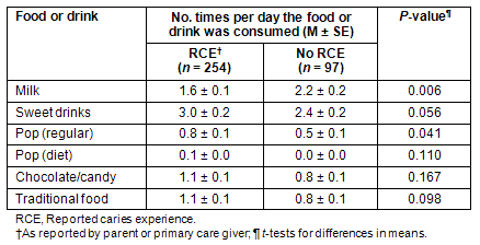 Univariate analyses revealed that children with RCE drank milk less often and soda pop more often than children with no RCE (Table 2). Children with RCE drank milk 1.6 ± 0.1 times per day, whereas children without RCE drank milk 2.2 ± 0.2 times per day (p ≤0.01). Children with RCE drank regular soda pop 0.8 ± 0.1 times per day compared with children without RCE who drank soda pop 0.5 ± 0.1 times per day (p ≤0.05). Children with RCE consumed slightly higher sweet drinks (3.0 ± 0.2 times per day) than children with no RCE (2.4 ± 0.2) but this difference only approached statistical significance (p = 0.06). No differences were seen in chocolate or candy consumption (p = 0.17) or in overall traditional food intake (p = 0.09). However, when all high-sugar foods from the FFQ were combined, children with RCE consumed high-sugar foods more often than children without RCE (4.9 ± 0.3 vs 3.7 ± 0.3 times/day, respectively, p ≤0.01).