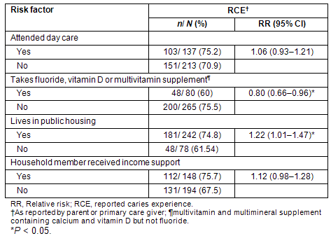 Socioeconomic characteristics, vitamin/supplement use, and daycare attendance were evaluated (Table 3). Children living in public housing were more likely to have RCE than those living in private housing (74% vs 61.5%, respectively, p <0.05), and children taking vitamins or supplements containing either vitamin D, calcium, or fluoride were less likely to have RCE than children not consuming these vitamins/supplements (60.0% vs 75.5%, respectively, p <0.01).