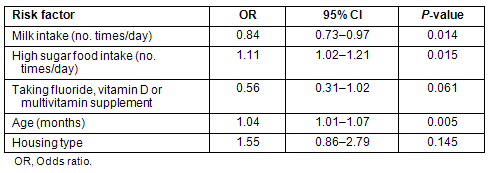 The multiple logistic regression model predicting an outcome of RCE contained frequency of milk intake, frequency of high sugar food intake, nutrition supplement use, child's age, and housing type (Table 4). In these analyses, taking a fluoride, vitamin D or multivitamin supplement was no longer significant. However, frequency of milk consumption remained significantly associated with RCE (OR = 0.84, 95% CI: 0.73-0.97) where an increase in milk consumption by 1 glass per day reduced the odds of having RCE by 16%. Frequency of high sugar food intake also remained significantly positively associated with the prevalence of RCE (OR = 1.11, 95% CI: 1.02-1.12) where an increase of one item per day of high-sugar food corresponded to an 11% increase in the odds of having RCE.