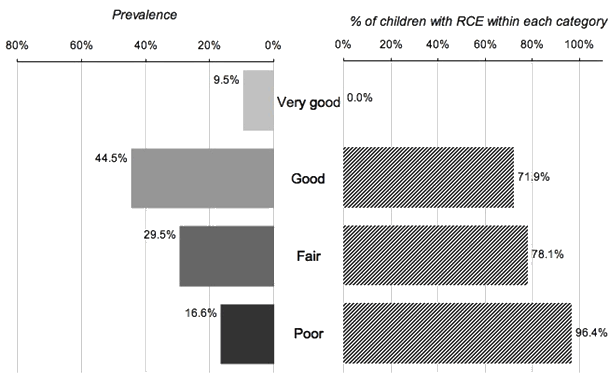 Fifty-three percent (204/388) of the participating children were female and the mean age was 4.4 ± 0.9 years. Cultural, socioeconomic, and health indicator characteristics have been presented elsewhere26. Unweighted and weighted prevalence estimates were similar. A weighted 69.1% (95% CI: 63.7-74.4%) of children had RCE (Table 1). No differences were found in the prevalence of RCE by region (χ2 p = 0.41). While 23% of children currently took any vitamin or supplement, very few children took a fluoride supplement (4.6%, 95% CI: 2.3-6.9%) or a vitamin D supplement (4.9%, 95% CI: 2.4-7.4%). Sixteen percent of children (95% CI: 12.3.-20.1%) were taking a multivitamin and multimineral supplement containing vitamin D and calcium but not fluoride. Very few parents rated their child's oral and dental health as 'very good': 9.5% (95% CI: 6.0-13.0%); whereas, the majority rated their child's health as 'good': 44.5% (95% CI: 38.9-50.1%), 'fair': 29.5% (95% CI:24.3-34.7%), or 'poor': 16.6 (95% CI:12.3-20.9%). The percentage of children with RCE varied by parental-reported oral health rating category (χ2 = 92.57, p <0.001) (Fig1). Children reported to have 'very good' oral health had no RCE, but there was no significant difference in the percentage of children with RCE between the 'good' and 'fair' categories, while more children had RCE in the 'poor' oral health category.