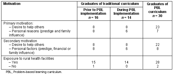 Overall, there was no marked difference in responses among graduates of the different curricula. However, in the discussion, community based training was identified as the main factor shaping the values and attitudes of those who were in favor of rural practice, and were confident and willing to work in a rural area. Issues identified included the availability of social amenities and affordable cost of living; ease of communication (no language or cultural barriers); personal safety and security considerations; the opportunity for career advancement; and considerations about workload.