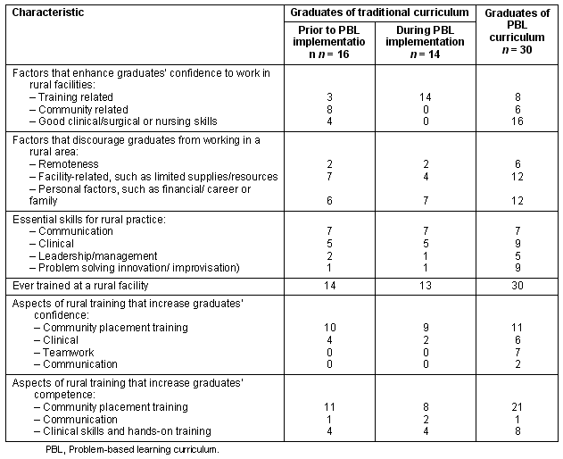 Graduates of the traditional and PBL curricula reported clinical, leadership, problem-solving and communication skills as essential to graduates succeeding professionally in rural practice (Table 2).