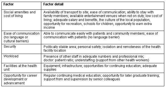 Other elements that attract staff include higher rates of remuneration, more satisfying working conditions and a safe working environment, as well as broader factors such as quality of life, freedom from political persecution, freedom of speech and educational opportunities for children22-26. The presence of social unrest and conflict has a major influence on where health workers seek employment, both within and outside their home countries21.