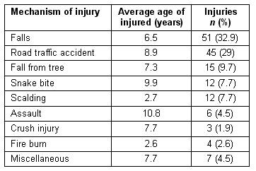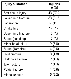 A retrospective case-note review was conducted on the notes of all paediatric patients (those aged 16 years and under) admitted to Kuluva Hospital in 2007 with trauma-related injuries. Data were collected on the mechanism of injury and the injuries sustained. The patient's age, sex, length of hospital stay and discharge destination were also recorded. Patients were excluded if their case notes were missing or incomplete.