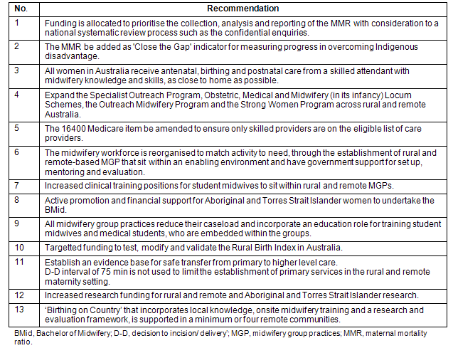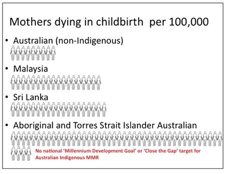 Some of the key factors in the success of these services are the collaborative community development approach to care; local employment; on-site midwifery training; integration of Inuit knowledge with western knowledge; the involvement of men; a risk screening process that includes social and cultural risks in addition to biomedical risks; and the interdisciplinary perinatal committee. This committee reviews each woman's case 32-34 weeks gestation for all risks, and creates a care plan for birth100. Conclusion In conclusion, there are increasing rather than decreasing challenges to the delivery of safe maternity services in rural and remote areas of Australia. Changing the way care is delivered could promote substantial improvements. Maternity providers must demonstrate the competencies required of skilled birth attendants. The midwifery workforce should be enabled to work to their full scope of practice with referral support from general practitioners with obstetric skills and specialist obstetric services, neither of which need to be 'named' or on site. With changes to the funding model in Australia, the provision of skilled, culturally appropriate care as close to home as possible for all women must be seen as a non-negotiable national priority. With slow progress being made towards closing the gap in MIH outcomes and culturally acceptable maternity care across Australia, and likely underreprting of poorer outcomes, it would seem appropriate to learn from others. Comparable counties, particularly Canada and New Zealand, have made substantial progress towards closing this gap. These countries come from similar colonial histories yet are leading the way, both in innovation of service models, midwifery in primary care settings and health outcomes for their Indigenous peoples103. Providing primary maternity services 'on country' must be explored. This should be done within a rigorous research framework using a community development approach that incorporates the training of Indigenous women as midwives and is led by the Indigenous community itself with support from an integrated network (Recommendation 13). We can no longer ignore the extraordinary results from the remote based Inuit models, particularly the unpredicted effects that are contributing to building community capacity and resilience. Communities that self identify this as a goal must be supported even when obstacles are described as insurmountable by service providers. We also believe Australia must take note of the millennium development goal and aim to reduce the MMR for Indigenous Australians from 45.9 per 100 000 (2000-2002) to 11.5 per 100 000 by 2015. Acknowledgments Sue Kildea is the Current Vice President of the CRANAplus, an organisation supporting and advocating for remote Australia and the provider of the MEC course. This article was supported by data from two NHMRC funded studies: (ID: 422503, all authors; ID: 571901, authors 3 and 4). References 1. Department of Health and Aging. Improving maternity services in Australia: A discussion paper from the Australian Government. Canberra, ACT: Commonwealth of Australia, 2008. 2. NSW Department of Health on behalf of the Maternity Services Inter-jurisdictional Committee. Primary maternity services in Australia: A framework for implementation. Canberra, ACT: Australian Health Ministers Advisory Council, 2008. 3. Australian Government. Steering Committee for the Review of Government Service Provision, Overcoming Indigenous Disadvantage Report. Canberra, ACT: Commonwealth of Australia: 2009. 4. Laws P, Sullivan E. Australia's mothers and babies 2007, Perinatal Statistics Series no. 23. Sydney, NSW: AIHW National Perinatal Statistics Unit, 2009. 5. Sullivan E, Hall B, King J (Eds). Maternal deaths in Australia 2003-2005. Sydney, NSW: AIHW National Perinatal Statistics Unit, 2008. 6. Kildea S. Maternal deaths high for Indigenous women. Women and Birth 2008; 21: 175-176. 7. Kildea S, Humphrey M, Sherwood J, Paterson B, Finn M, Black D et al. Maternal mortality in Aboriginal and Torres Strait Islander women. In: J King, E Sullivan (Eds). Maternal Deaths in Australia 2000-2002. Canberra, ACT: AIHW, 2006; 75-81. 8. Ronsmans C, Graham WJ for Lancet Maternal Survival Series Steering Group. Maternal mortality: who, when, where and why. Lancet 2007; 368(9543): 1189-1200. 9. Sullivan E, Kildea S, Black D. Epidemiology of Maternal Deaths. In: J King, E Sullivan (Eds). Maternal Deaths in Australia 2000-2002. Canberra, ACT: AIHW, 2006; 8-31. 10. Laws P, Hilder L. Australia's mothers and babies 2006, Perinatal Statistics Series no. 22. Sydney, NSW: AIHW National Perinatal Statistics Unit, 2008. 11. Australian Bureau of Statistics. 4102.0 - Australian Social Trends, 2008. Population Distribution. (Online) 2008. Available: http://www.abs.gov.au/AUSSTATS/abs@.nsf/Lookup/4102.0Chapter3002008 (24 March 2009). 12. Trewin D, Madden R. The Health and Welfare of Australia's Aboriginal and Torres Strait Islander Peoples. Canberra, ACT: Australian Bureau of Statistics, Australian Institute of Health and Welfare, 2005. 13. Laws P, Abeywardana S, Walker J, Sullivan E. Australia's mothers and babies 2005, Perinatal Statistics Series no. 20. Sydney, NSW: AIHW National Perinatal Statistics Unit, 2007. 14. Australian Bureau of Statistics, Australian Institute of Health and Welfare. The Health and Welfare of Australia's Aboriginal and Torres Strait Islander Peoples 2005. Canberra, ACT: Australian Bureau of Statistics and the Australian Institute of Health and Welfare, 2005. 15. Fremantle C, Read A, de Klerk N, McAullay, Anderson I, Stanley F. Patterns, trends and increasing disparities in mortality for Aboriginal and non-Aboriginal infants born in Western Australia, 1980-2001: population database study. Lancet 2006; 367: 1758-1766. 16. Johnston T, Coory M. Reducing perinatal mortality among Indigenous babies in Queensland: should the first priority be better primary health care or better access to hospital 