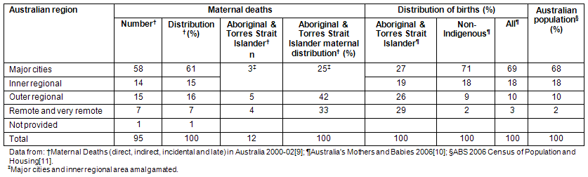 Although there is no demonstrated causal pathway and the numbers are small, Table 2 shows that the proportion of maternal deaths to women who were resident in remote areas (7%) was higher than the proportion of women who gave birth from these areas (3%). Outer regional Australia accounted for 16% of maternal deaths and 10% of births. It can also be seen that 29% of Aboriginal and Torres Strait Islander births are to women living in remote and very remote areas compared with 2% of non-Indigenous births.