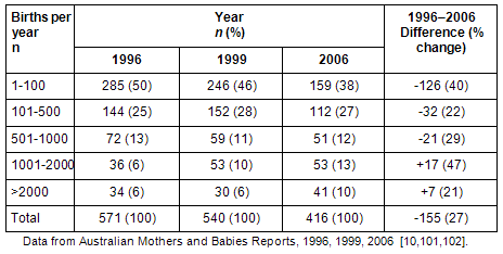 Table 3: Hospitals and birth centres by number of women who gave birth in 1996, 1999 and 200610,11,101,102