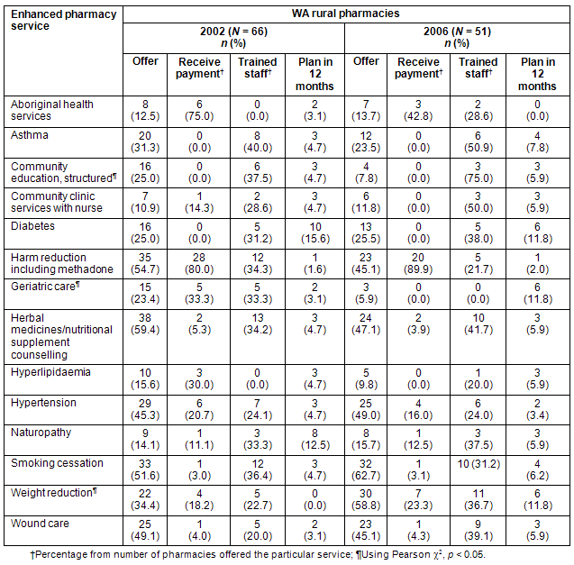 Table 1: Comparison of Western Australian rural pharmacies that offered enhanced pharmacy services by trained staff, fees charged and planning in 12 months, in 2002 and 2006