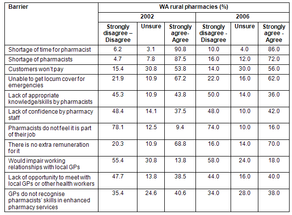 Table 2: Comparison of barriers to enhanced pharmacy services reported by Western Australian rural pharmacies in 2002 and 2006