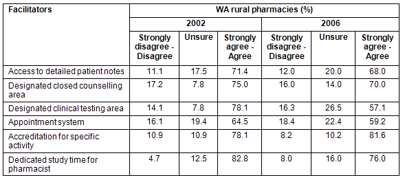 Table 3: Comparison of facilitators for enhanced pharmacy services reported by Western Australian rural pharmacies in 2002 and 2006