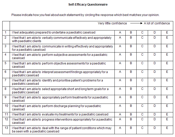 The questionnaire was designed in two parts and included 13 items specific to tasks undertaken in a paediatric physiotherapy practice domain (Appendix I). The first part was to obtain demographic and background details of the physiotherapist participant, while the second part was to obtain a quantitative picture of the self-efficacy scores of the participants with regards to working with paediatric caseloads. Self-efficacy was measured on a 5 point Likert scale ('very little confidence' to 'a lot of confidence'). Pajares has demonstrated that researchers assess self-efficacy beliefs by asking individuals to report the level, generality, and strength of their confidence to accomplish a task or succeed in a certain situation16. The self-efficacy questionnaire used was slightly modified from a previous JCU research project and is based on the ideas of Pajares, which determine that self-efficacy should be measured in terms of personal judgments of capability that vary across a realm of activity, different levels of task demands and under different circumstances, so as to not result in a generalised or global measurement16.