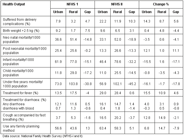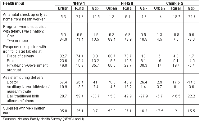 A positive net change in health input occurred during 1992-1998 but urban rural differentials still existed in Andhra Pradesh. Mothers in rural areas not provided with antenatal care and delivery by trained persons may be more likely to develop postnatal complications that endanger their lives.